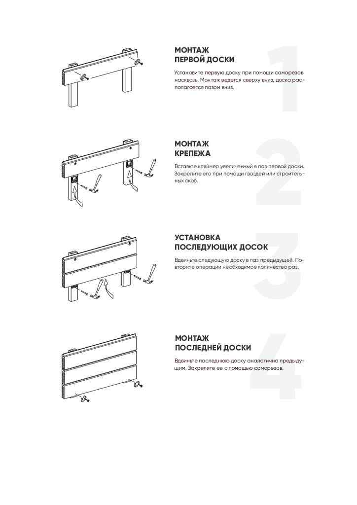Крепеж изготовлен из оцинкованной стали толщиной 0,5 мм. По габаритам в 2 раза превосходит стандартный кляймер для вагонки. Широкая лапка с двумя ребрами жесткости у основания крепче прижимает доску к направляющим и выдерживает больший вес, чем кляймер для вагонки. Два ребра жесткости по бокам крепления приподнимают доску на 0,5 мм над телом крепежа и создают дополнительную микровентиляцию между направляющей и доской. Два овальных наклонных отверстия предназначены для использования строительных скоб, изогнутая лапка повышает комфорт монтажа.